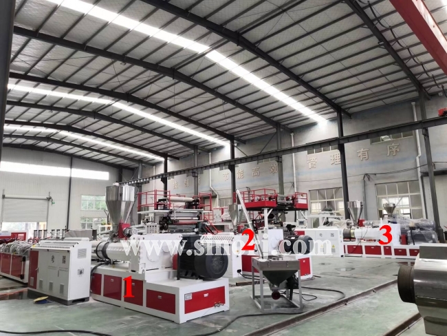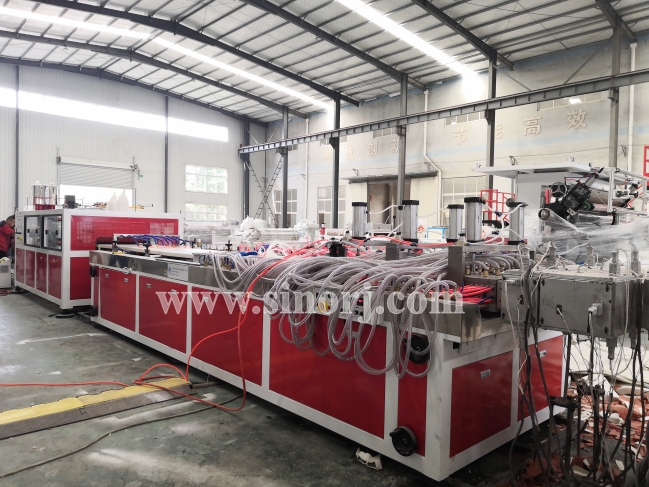 等待發(fā)貨的三套設備:PVC木塑中空門板設備,仿大理石設備,SPC地板設備。